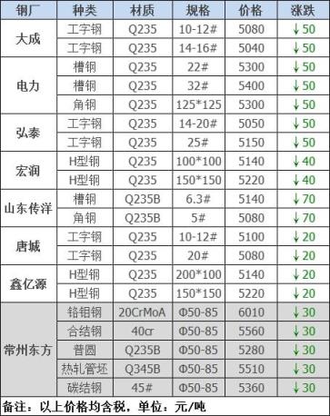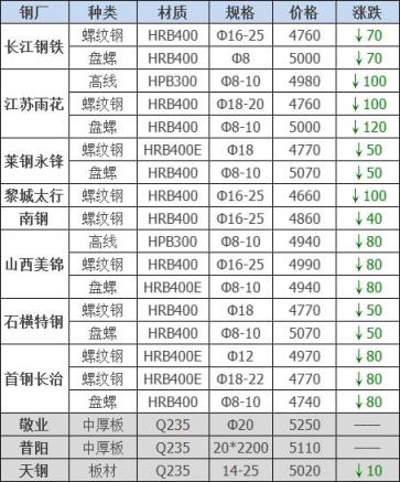 25日12:00起江陰西城刨花類下調(diào)50-60,其他不變,調(diào)后:精爐料4000重廢3890中廢3830普通爐料3770鋼筋頭4000沖子3890-3940冷熱軋料3790-3890爐料壓塊3600鐵皮壓塊3300鋼刨花3600數(shù)控刨花3510普通刨花3420刨花壓塊3360刨花長(zhǎng)絲3310含稅單位:元/噸。