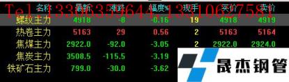 今日螺紋主力期貨跌8,收報(bào)4918,跌幅0.16%;熱卷主力漲29,收報(bào)5163,漲幅0.56%;焦煤主力跌92,收報(bào)2922,跌3.05%;焦炭主力跌115.5,收報(bào)3508.5,跌幅3.19%;鐵礦石主力跌30,收報(bào)799,跌幅3.62%。